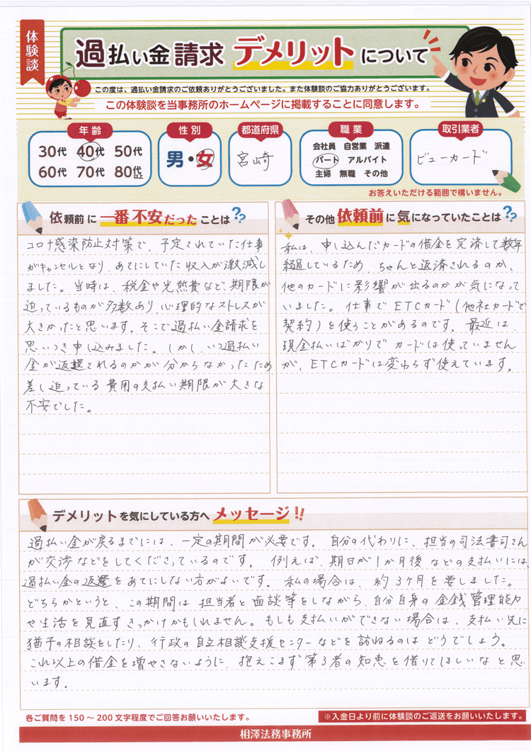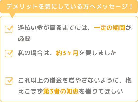 しかし、いつ過払い金が返還されるのかが分からなかったため、差し迫っている費用の支払い期限が大きな不安でした。