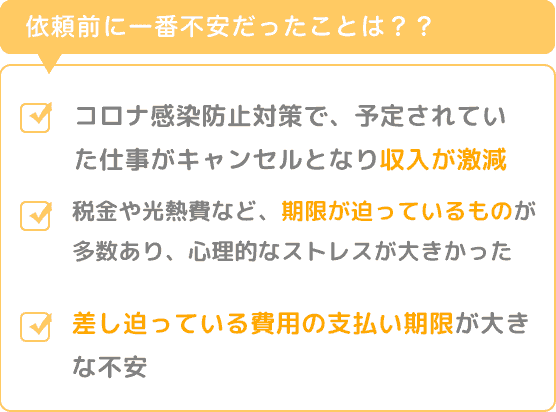 当時は、税金や光熱費など、期限が迫っているものが多数あり、心理的なストレスが大きかったと思います。