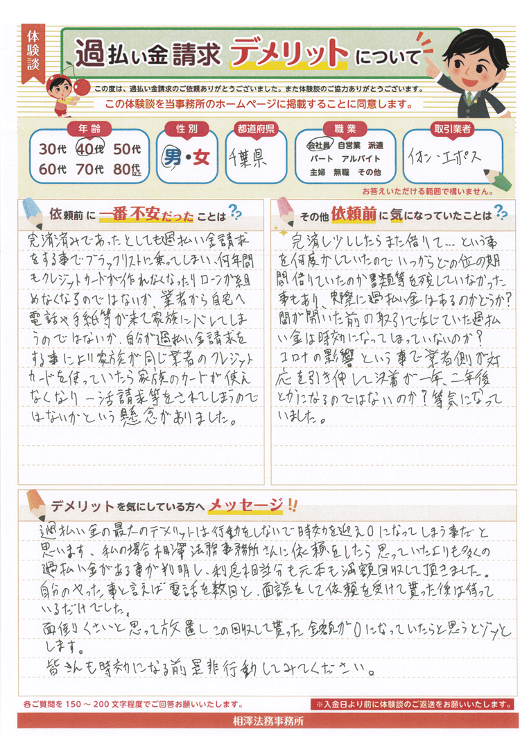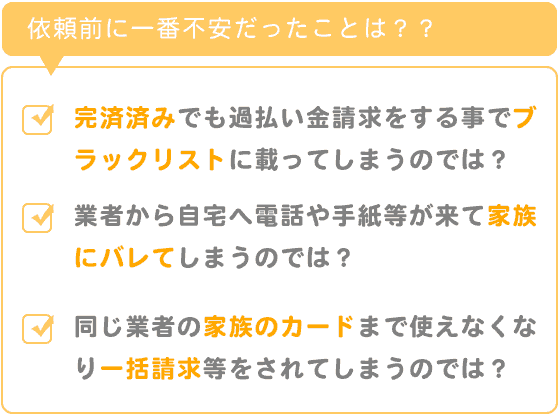 完済済みであったとしても過払い金請求をする事でブラックリストに載ってしまい、何年間もクレジットカードが作れなくなったりローンが組めなくなるのではないか、業者から自宅へ電話や手紙等が来て家族にバレてしまうのではないか、自分が過払い金請求をする事により家族が同じ業者のクレジットカードを使っていたら家族のカードが使えなくなり一括請求等をされてしまうのではないかという懸念がありました。