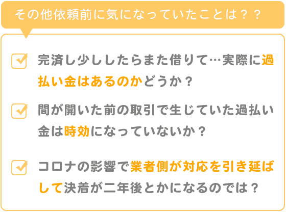 完済し少ししたらまた借りて…という事を何度かしていたのでいつからどの位の期間借りていたのか書類等を残していなかった事もあり、実際に過払い金はあるのかどうか?間が開いた前の取引で生じていた過払い金は時効になってしまっていないのか?コロナの影響という事で業者側が対応を引き伸して決着が一年、二年後とかになるのではないのか?等気になっていました。