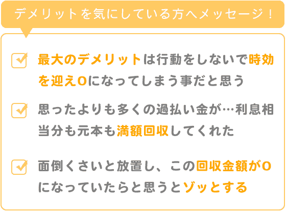 過払い金の最大のデメリットは行動をしないで時効を迎え0になってしまう事だと思います。