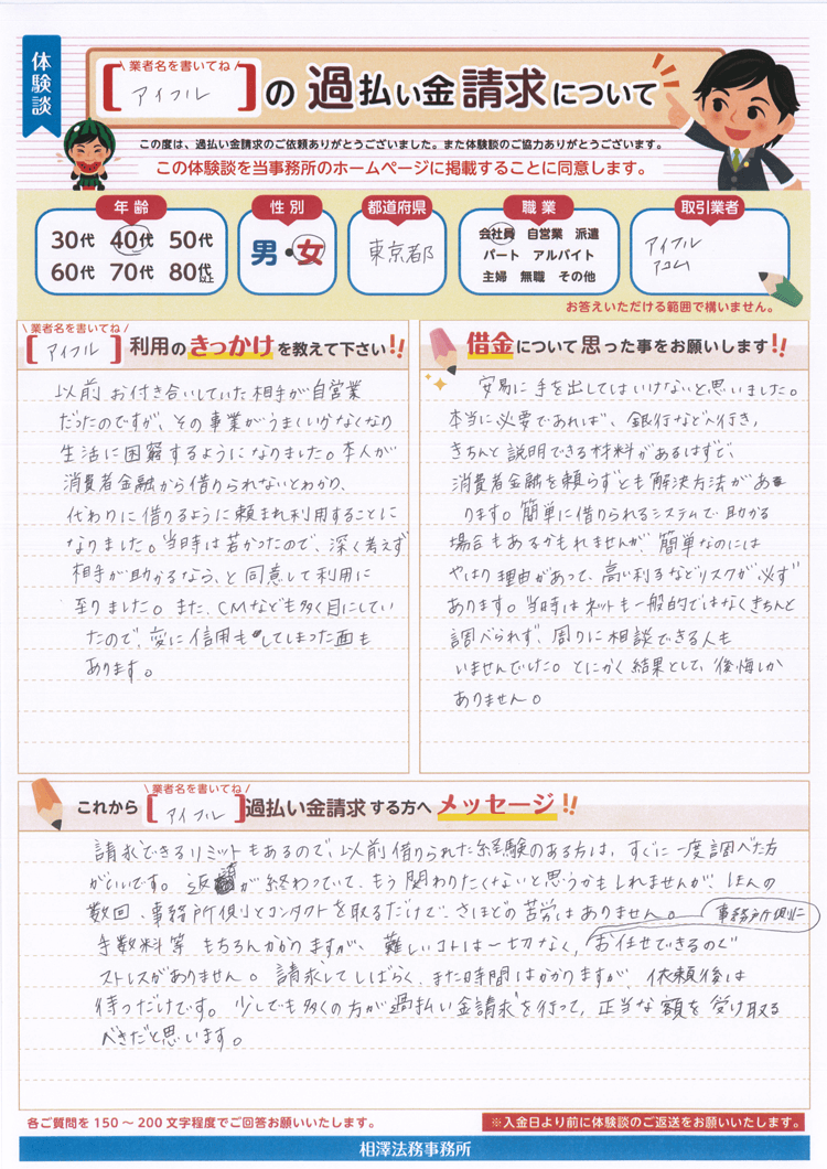 当時は若かったので、深く考えず相手が助かるなら、と同意して利用に至りました。