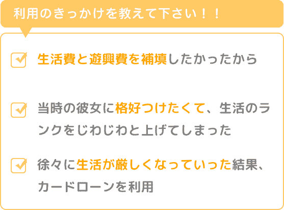 独身でしたし少しは稼いでいたので、お金に困るほどではなかったのですが、当時の彼女に格好つけたくて、もう少し上のランクの洋服、もう少し上のランクの食事、もう少し上のランクの住居、と生活のランクをじわじわと上げてしまい、徐々に生活が厳しくなっていった結果、カードローンを利用してしまいました。