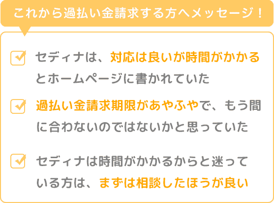 自分の場合は過払い金請求期限があやふやだったこともあり、もう間に合わないのではないかと思って相談するのを迷っていましたが、過払い金請求を申請した段階で期限内であれば大丈夫とのことだったので、セディナは時間がかかるからどうしようかと迷っている方は、まずは相談したほうが良いと思います。