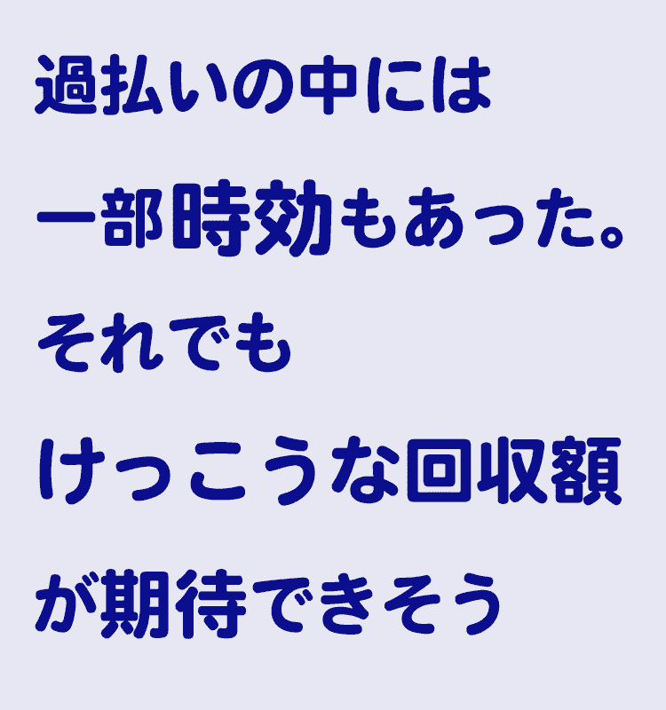 過払いの中に一部時効になっていた分があったものの、裁判ありでお願いすることで全額プラス利息分の返金を受けることが出来そうです。