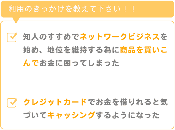 知り合いの人にすすめられて、ネットワークビジネスを始め、その地位(下の人の売上から利益をもらう権利)を維持する為に自分も一定額以上の売り上げをあげないというシステムになっていて、その売上げを上げ続けるのが難しくなり、商品を買いこんでお金に困っていた時に、クレジットカードのキャッシング枠でお金を借りれることに気づいてキャッシングするようになりました。
