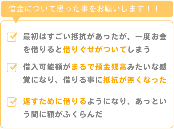 最初はすごい抵抗があったけど、一度お金を借りる経験をしてしまうと、借りぐせがついてしまうというか、後の返済のことをよく考えられず、借り入れ可能額がまるで預金残高みたいな感覚になってしまい、借りる事に抵抗が無くなってしまう。