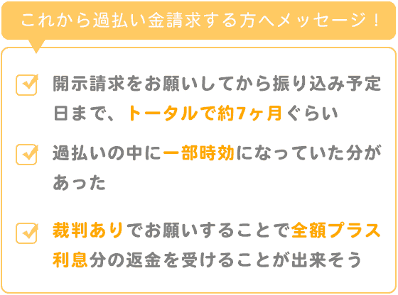 開示請求をお願いしてから面談を受けて依頼をするまでに1~2ヶ月、それから3ヶ月ほどしてセディナ側から返金する旨をその振り込み日の連絡があったとの連絡をもらい、その振り込み予定日が2ヶ月後ぐらい、トータルで約7ヶ月ぐらいの期間になります。