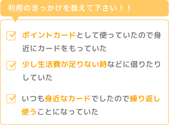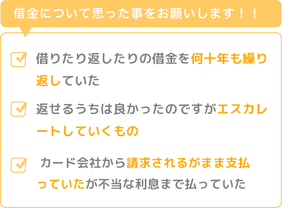 最初は仕事や生活の為の大きなお金を借り翌月一括返済していましたが段々と借りていることが多くなり返済がしんどくなってきました。