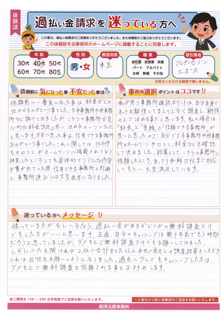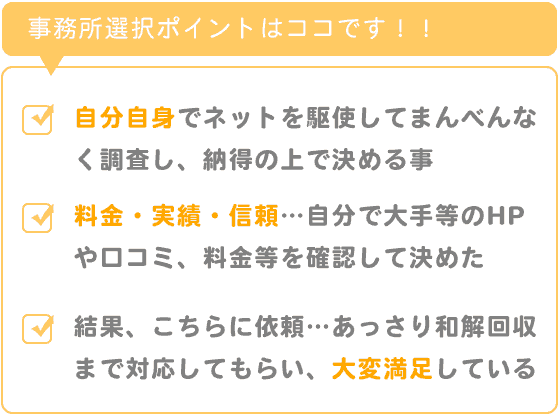 結果として、こちらの事務所に依頼したところ、あっさり和解回収まで対応してもらい、大変満足しています。