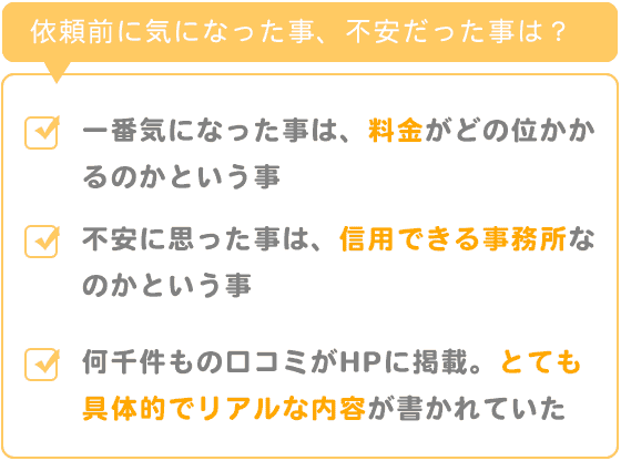 これに関しては、何千件もの口コミがホームページに掲載されており、拝見したところとても具体的でリアルな内容が書かれていた為、信用できる事務所と判断し、事務所選びには大変参考になりました。
