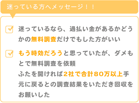 迷っている方がもしいるなら、過払い金があるかどうかの無料調査だけでもした方がいいと思います。