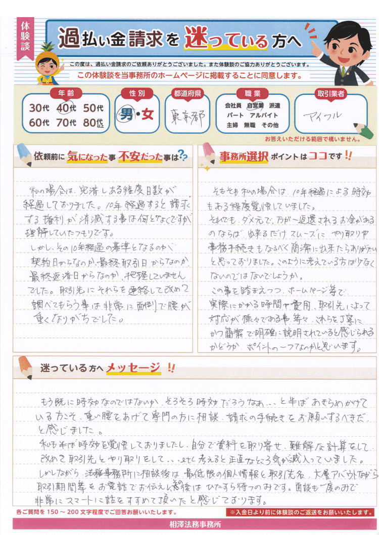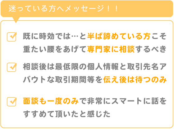 もう既に時効なのではないか、そろそろ時効だろうなあ…と半ばあきらめかけている方こそ、重たい腰をあげて専門の方に相談、請求の手続きをお願いするべきだと感じました。