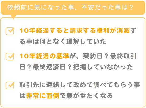 しかし、その10年経過の基準となるのが契約日からなのか、最終取引日からなのか最終返済日からなのか、把握していませんでした。