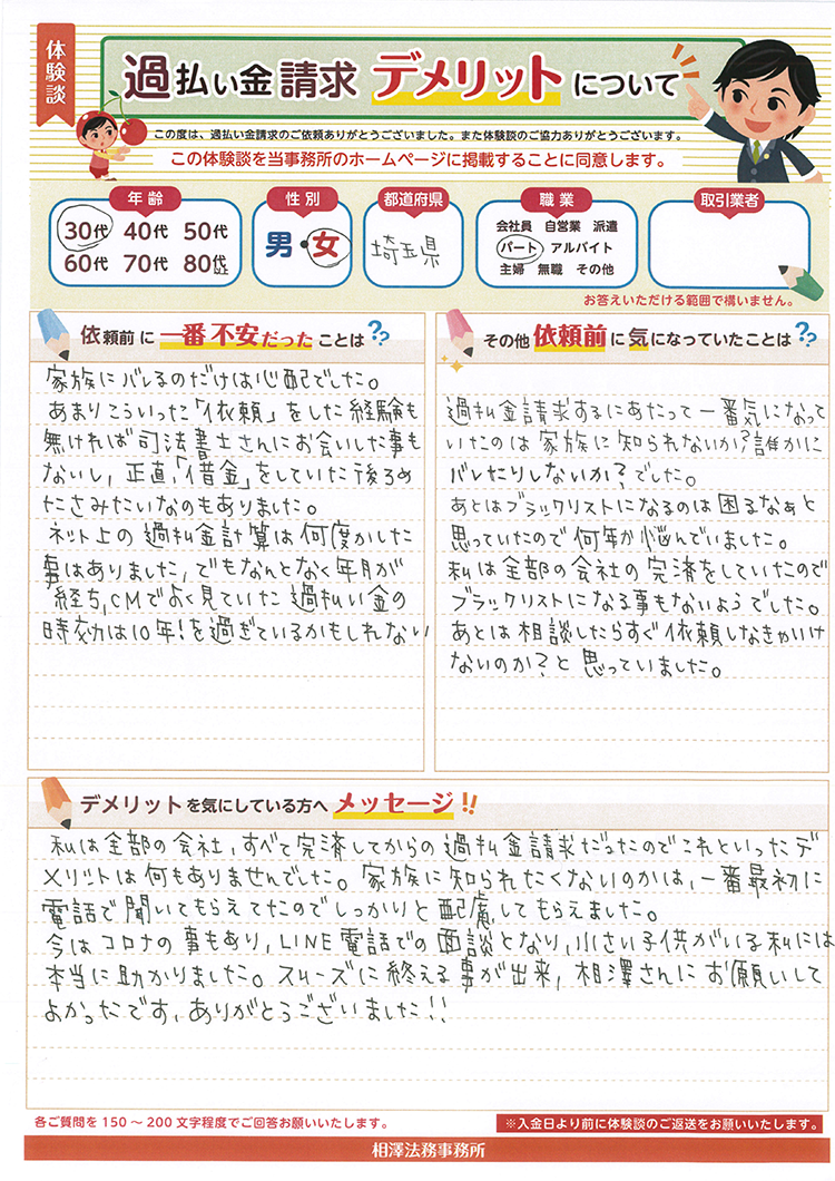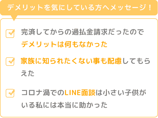 私は全部の会社、すべて完済してからの過払金請求だったのでこれといったデメリットは何もありませんでした。家族に知られたくないのかは、一番最初に電話で聞いてもらえていたのでしっかりと配慮してもらえました。今はコロナの事もあり、LINE電話での面談となり、小さい子供がいる私には本当に助かりました。スムーズに終える事が出来、相澤さんにお願いしてよかったです、ありがとうございました!!