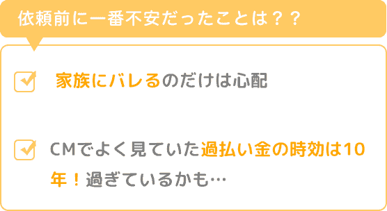 家族にバレるのだけは心配でした。あまりこういった「依頼」をした経験も無ければ司法書士さんにお会いした事もないし、正直、「借金」をしていた後ろめたさみたいなのもありました。ネット上の過払金計算は何度かした事はありました、でもなんとなく年月が経ち、CMでよく見ていた過払い金の時効は10年!を過ぎているかもしれない