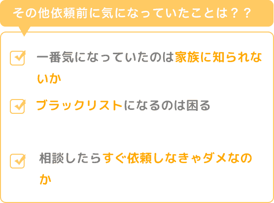 過払金請求するにあたって一番気になっていたのは家族に知られないか?誰かにバレたりかしないか?でした。あとはブラックリストになるのは困るなぁと思っていたので何年か悩んでいました。私は全部の会社の完済をしていたのでブラックリストになる事もないようでした。あとは相談したらすぐ依頼しなきゃいけないのか?と思っていました。