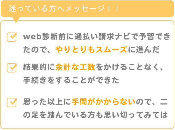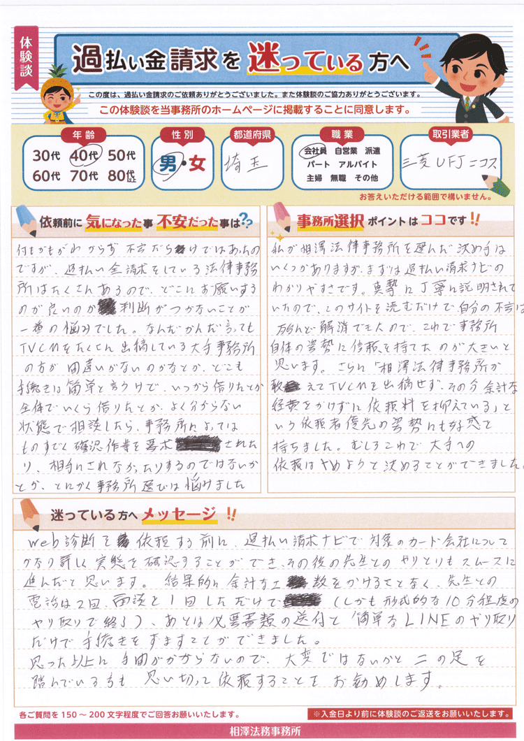 web診断を依頼する前に、過払い請求ナビで対象のカード会社についてかなり詳しく実態を確認することができ、その後の先生とのやりとりもスムーズに進んだと思います。