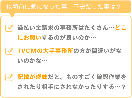 何もかもがわからず不安だらけではあったのですが、過払い金請求をしている法律事務所はたくさんあるので、どこにお願いするのが良いのか判断がつかないことが一番の悩みでした。