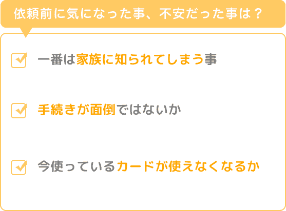 一番は家族に知られてしまう事でした。けれど事厶所の方対応はこちらの意向くみとり家族のいない時間に対応していただけました。