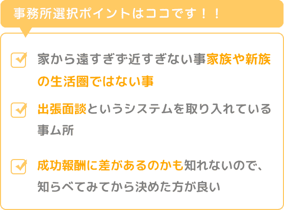 まず家から遠すぎず近すぎない事家族や新族の生活圏ではない事近くに事厶所が無い場合は出張面談というシステムを取り入れている事厶所もある用なのでそう言う事厶所を選ぶと良いと思います。