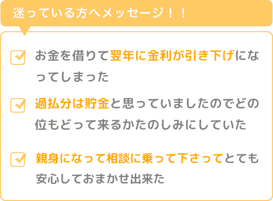 みなさんも少し勇気を出して請求してみて下さい。私の選んだ相沢法務事厶所の方はみなさんとても親身になって相談に乗って下さってとても安心しておまかせ出来ました過払い金は自分のお金ですガンバッテ取りもどして下さい。
