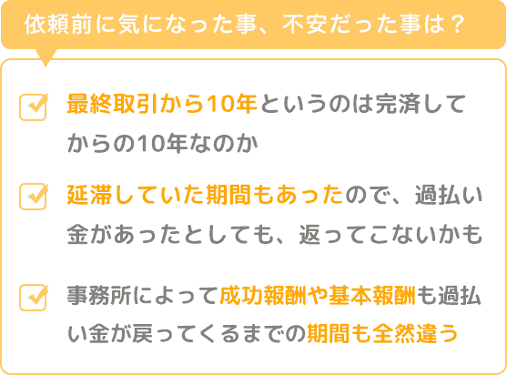 過払い金があるのか無いのか、最終取引から10年というのは完済してからの10年なのか、延滞していた期間もあったので、過払い金があったとしても、返ってこないかもしれないなとか色々思うところがあって、なかなか相談まで踏み込めずにいましたが、相澤法務事務所さんのサイトをみて、一度相談だけでもしてみようと思いました。