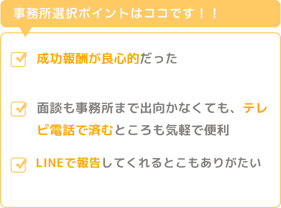 他社に依頼していないので比較はできませんが、成功報酬が良心的だったのと、初めに電話で話した時の印象も良くとくにこちらで何かするような面倒な事もなかったのでお任せする形で安心感がありました。
