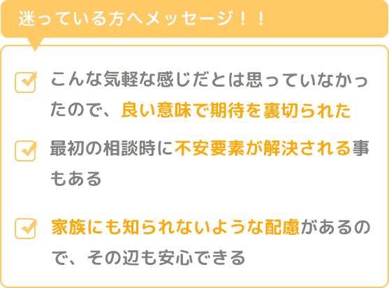 家族がいらっしゃる方の場合も、知られないような配慮があるので、その辺も安心できるかと思います。