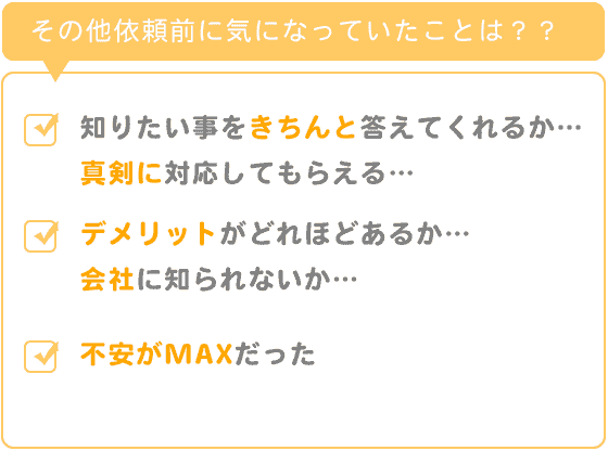 現実的にデメリットがどれほどあって、個人情報(セキュリティ的に)問題ないか、会社に知られないか、現在持っているカードは影響ないか、どのような手続きがいるのか、質問内容が理解してもらえるか等、不安がMAXでした。