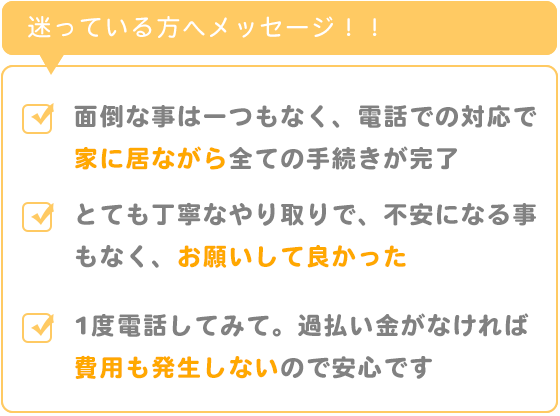 色々な不安があり、なかなか1歩ふみ出せずにいましたが、面倒な事は一つもなく、電話での対応で、家に居ながら、全ての手続きを完了できました。