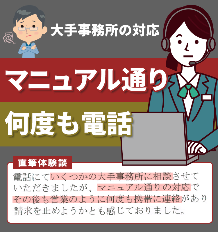 電話にていくつかの大手事務所に相談させていただきましたが、マニュアル通りの対応でその後も営業のように何度も携帯に連絡があり請求を止めようかとも感じておりました。