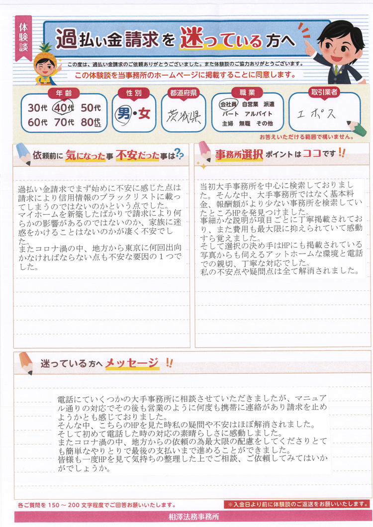 マイホームを新築したばかりで請求により何らかの影響があるのではないか、家族に迷惑をかけることはないのかが凄く不安でした。
