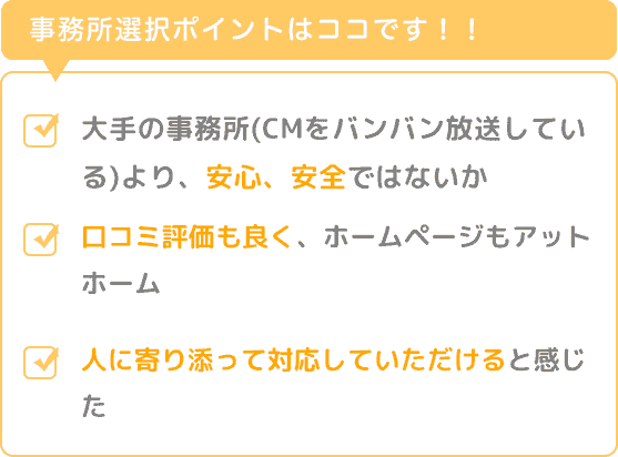 スマホから情報を色々拝見している中で、大手の事務所(CMをバンバン放送している)より、安心、安全ではないかと思いました。