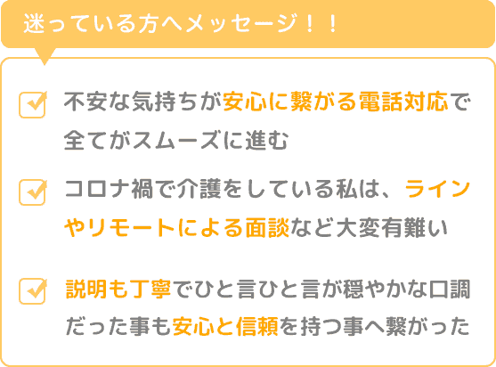 コロナ禍で介護をしている私は、ラインやリモートによる面談など大変有難く、説明も丁寧でひと言ひと言が穏やかな口調だった事も安心と信頼を持つ事へ繋がりました。