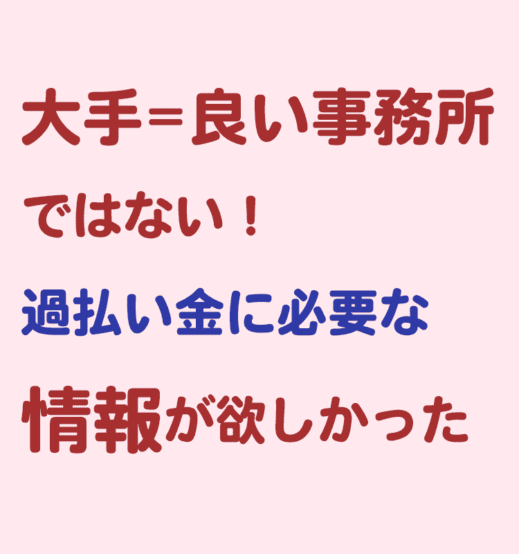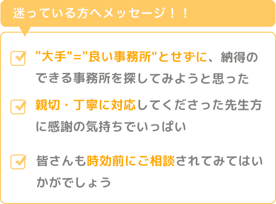 そして、当初の思い込みでもある”大手”=”良い事務所”とせずに、まずは少し調べてみて納得のできる事務所を探してみようと思ったことが好判断でした。