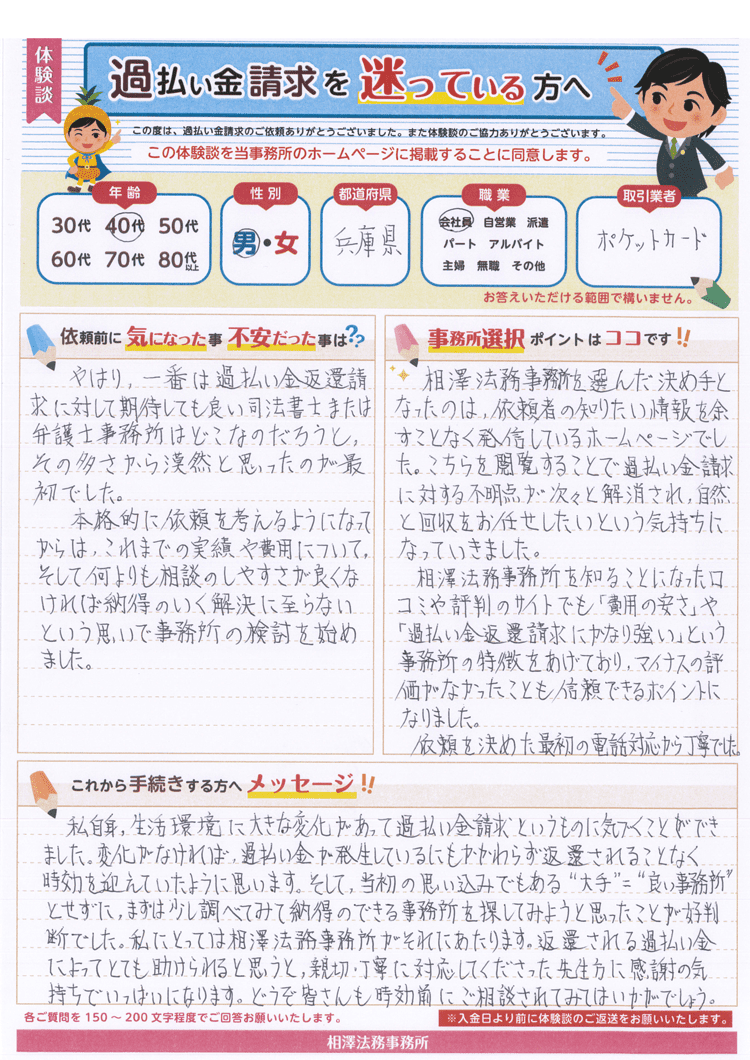 返還される過払い金によってとても助けられると思うと、親切・丁寧に対応してくださった先生方に感謝の気持ちでいっぱいになります。