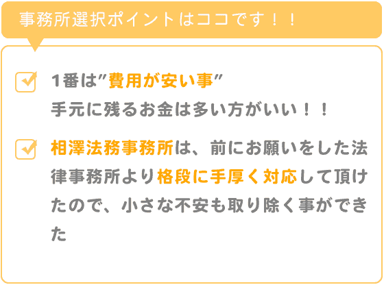 しかし、それだけではなく、相澤法務事務所さんは、前にお願いをしていた法律事務所さんよりも、格段に手厚く対応して頂けたので、小さな不安も取り除く事ができました。