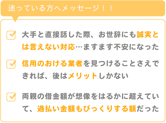 当方は自身の借金ではなく亡くなった両親の借金で、いつ、いくら、どこで借りていたのか確かな情報がなく、支払いが完了しているのかもわからなかったことや、過払い金請求することで、当方に影響があるのではないかということが不安材料でした。