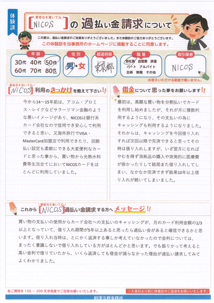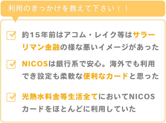今から14~15年前は、アコム・プロミス・レイクなどサラーリマン金融のような悪いイメージがあり、NICOSは銀行系カード会社なので信用でき安心して利用できると思い、また海外旅行でVISA・MasterCard加盟店で利用できたり、回数払い設定も柔軟にできる大変便利なカードと思った事から、買い物から光熱水料金等生活全てにおいてNICOSカードをほとんどに利用していました。