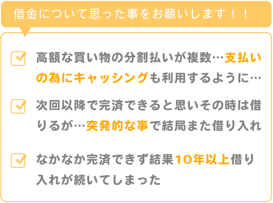それからは、キャッシングを今回借り入れすれば次回以降で完済できると思ってその時は借り入れしますが、いざ翌月になればやむを得ず消耗品の購入や突発的に医療費が掛かったりして結局また借り入れしてしまい、なかなか完済できず結果10年以上借り入れが続いてしまいました。