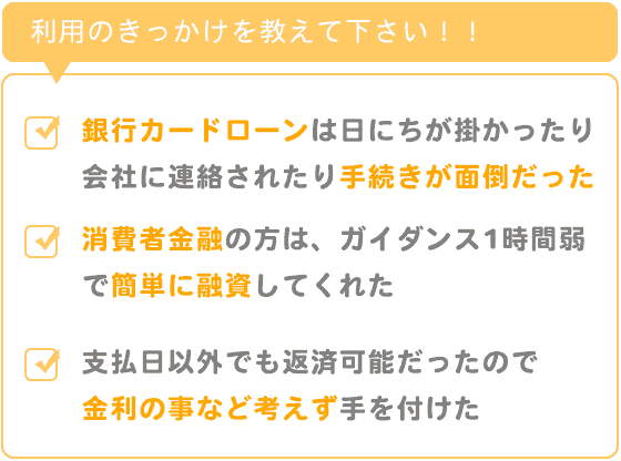 当初、色々遊びたいという気持ちから、何とかして、お金を作りたく、銀行カードローンですと、当初、日にちが掛かったり会社に連絡をされ在宅されているか、本人確認、その後、書類提出等、色々めんどくさくなり、消費者金融の方に相談をした所、何事もなく、ガイダンスの1時間弱で簡単にお金を融資してくれて、支払いも決まった日以外でも何回でも返済可能だったので金利の事など考えず、通常の銀行ローンよりもやさしく借りても、すぐ返せると思い手をつけました。