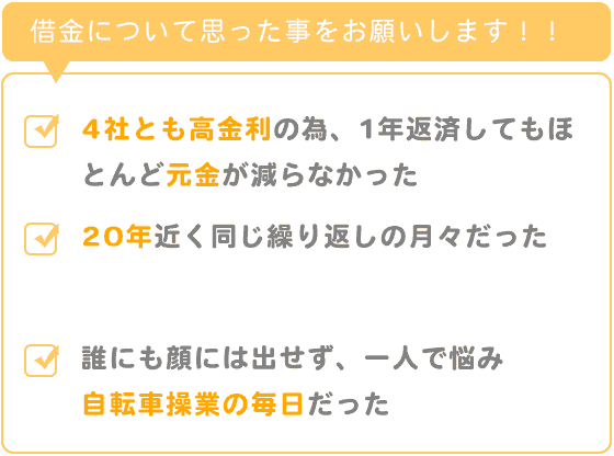さすがに4社とも高金利の為1年返済をして経過しても、ほとんど返済金額が全くと言っていい程、金額が減ず、20年近く同じ繰り返しの月々で、仕事中はもちろんの事、プライベートの時も誰にも顔には出せず、一人で悩み、自転車操業の毎日でした。