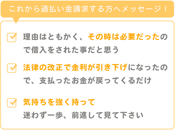 ただ、法律の改正で金利が引き下げになったので、今までの自分の支払いをしたお金が戻ってくるだけです。