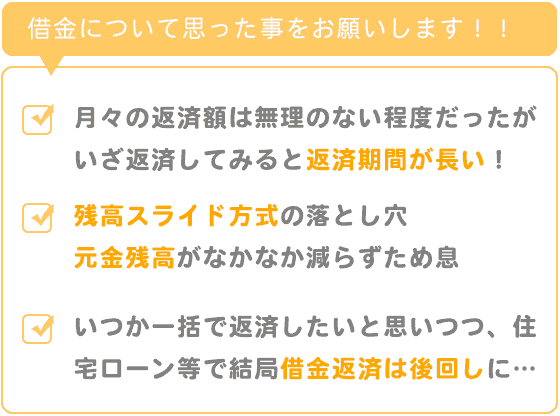 いつか一括で返済したいと思いつつ住宅ローンや教育費にかかり結局借金返済は後回しになってしまうのが現実です。