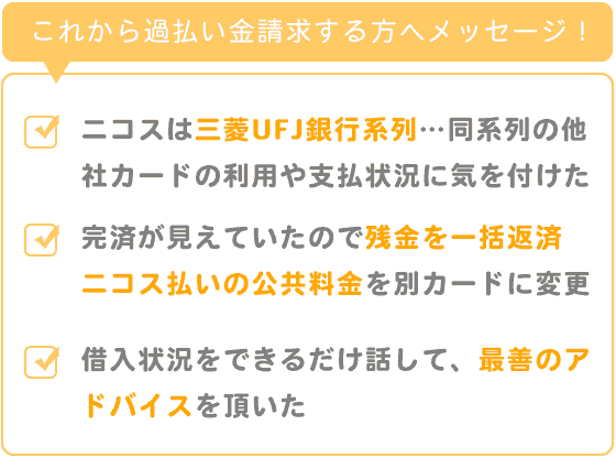 過払い請求するにあたり、ニコスは三菱UFJ銀行系列なので同系列の他社カードの利用や支払い中のものがないか気を付けました。