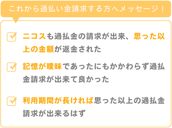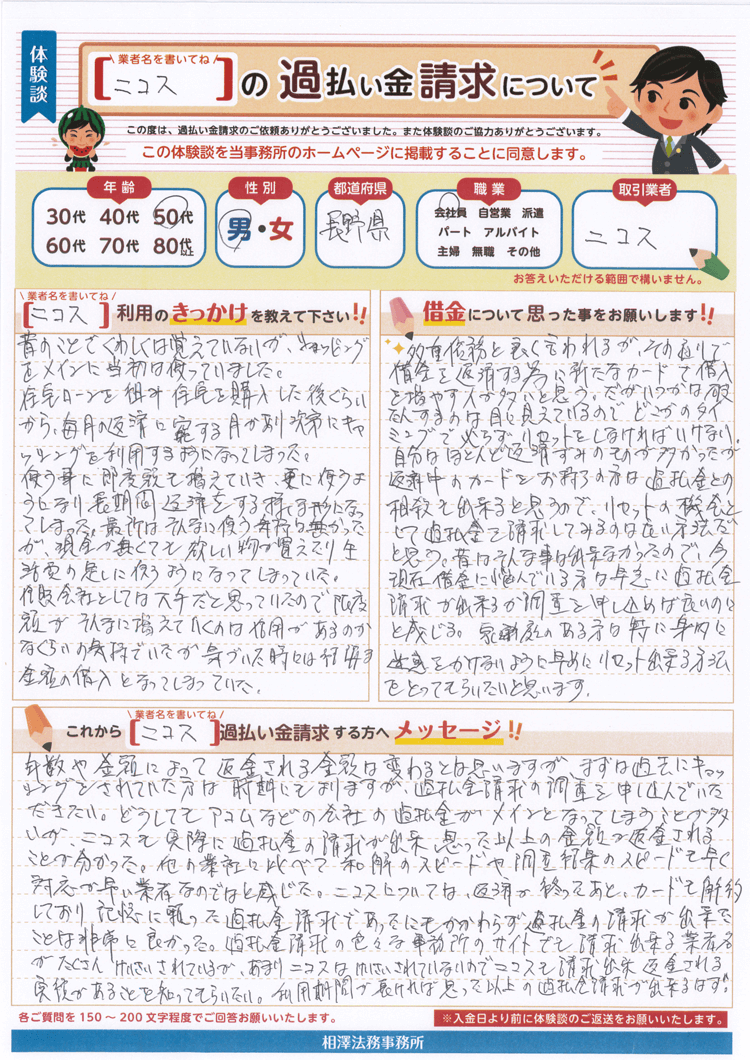 ニコスについては、返済が終わったあと、カードも解約しており記憶に頼った過払金請求であったにもかかわらず過払金の請求が出来たことは非常に良かった。