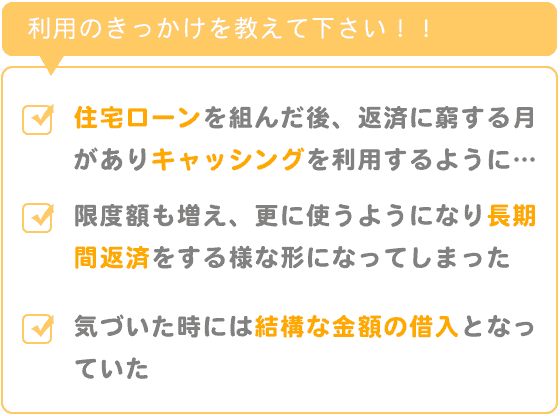 住宅ローンを組み住宅を購入した後くらいから、毎月の返済に窮する月があり次第にキャッシングを利用するようになってしまった。