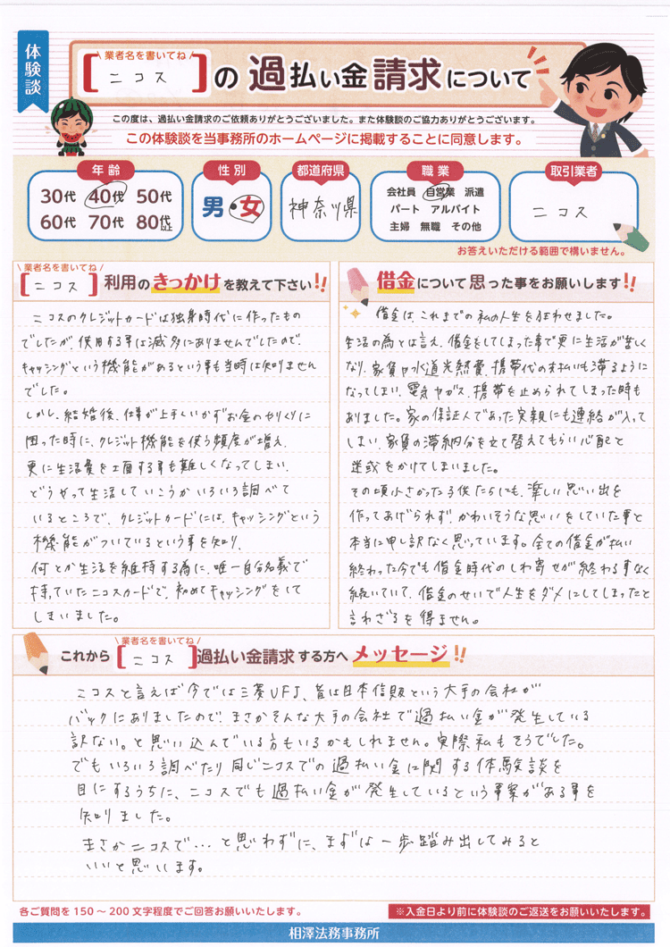 でもいろいろ調べたり同じニコスでの過払い金に関する体験談を目にするうちに、ニコスでも過払い金が発生しているという事実がある事を知りました。