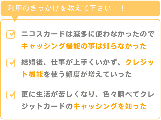 しかし、結婚後、仕事が上手くいかずお金のやりくりに困った時に、クレジット機能を使う頻度が増え、更に生活費を工面する事も難しくなってしまい、どうやって生活していこうかいろいろ調べているところで、クレジットカードには、キャッシングという機能がついているという事を知り、何とか生活を維持する為に、唯一自分名義で持っていたニコスカードで、初めてキャッシングをしてしまいました。